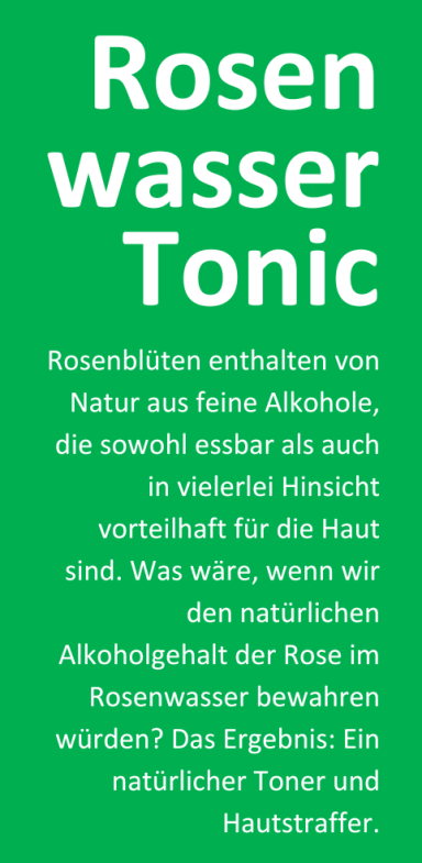 Mit dem erhöhten Anteil an natürlichem Rosenalkohol hebt sich unser Rosenwasser Tonic klar vom Markt ab. Es verbindet die Wirksamkeit eines Toners mit der Reinheit eines Naturprodukts, das man sogar trinken könnte.